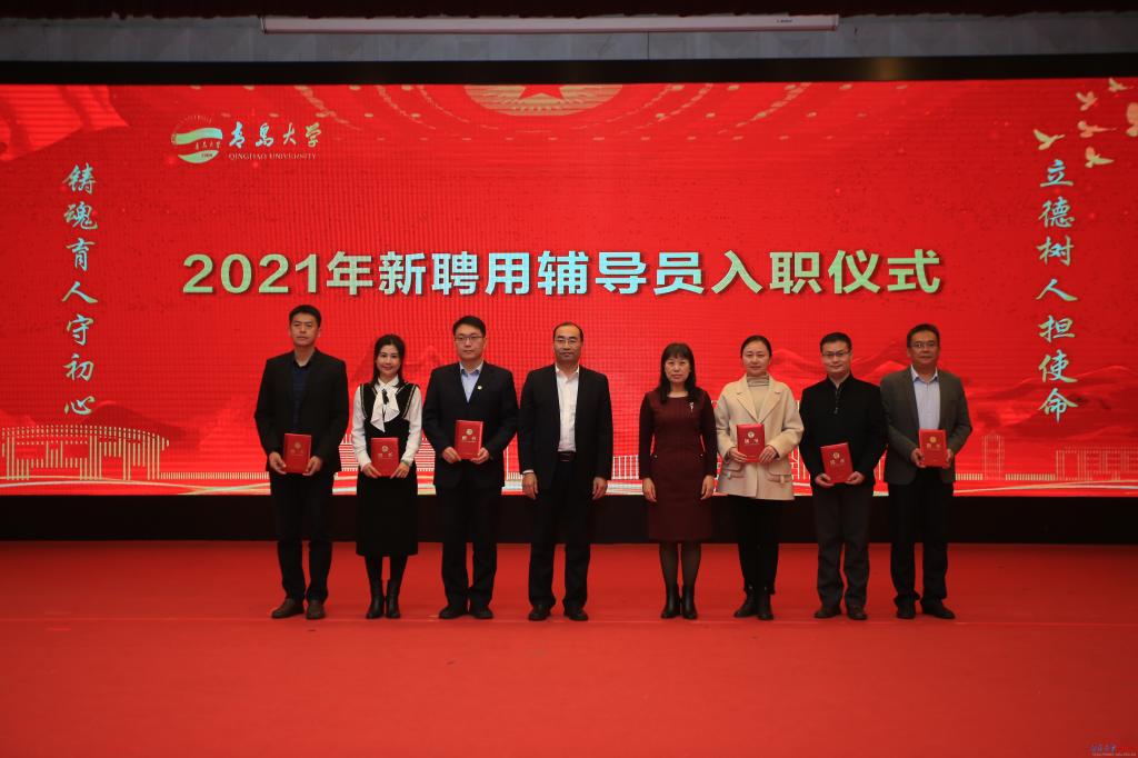 黨委書記胡金焱為39位新聘用輔導員頒發了校徽。輔導員導師與新聘用輔導員進行師徒結對并贈送書籍,2020年度在青高校優秀輔導員、文學與新聞傳播學院輔導員曹珺帶領全體輔導員進行了集體宣誓。2020年度青島大學輔導員年度人物、數學與統計學院輔導員李玲慧作為輔導員導師代表發言,新聘用輔導員代表以朗誦的形式表達了入職心聲。
