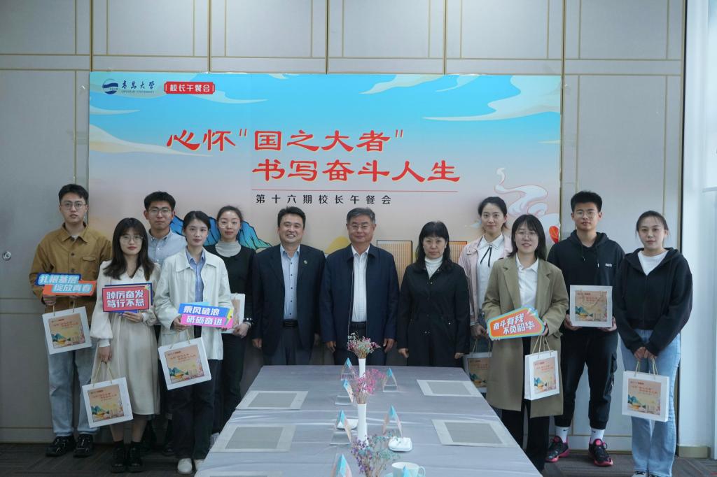 新聞網訊 5月12日中午,我校舉辦主題為“心懷‘國之大者’,書寫奮斗人生”第十六期校長午餐會。在“印象青大”餐廳,校長夏東偉,黨委常委、副校長劉彩云等與9位2022屆畢業生共進午餐、暢談未來。