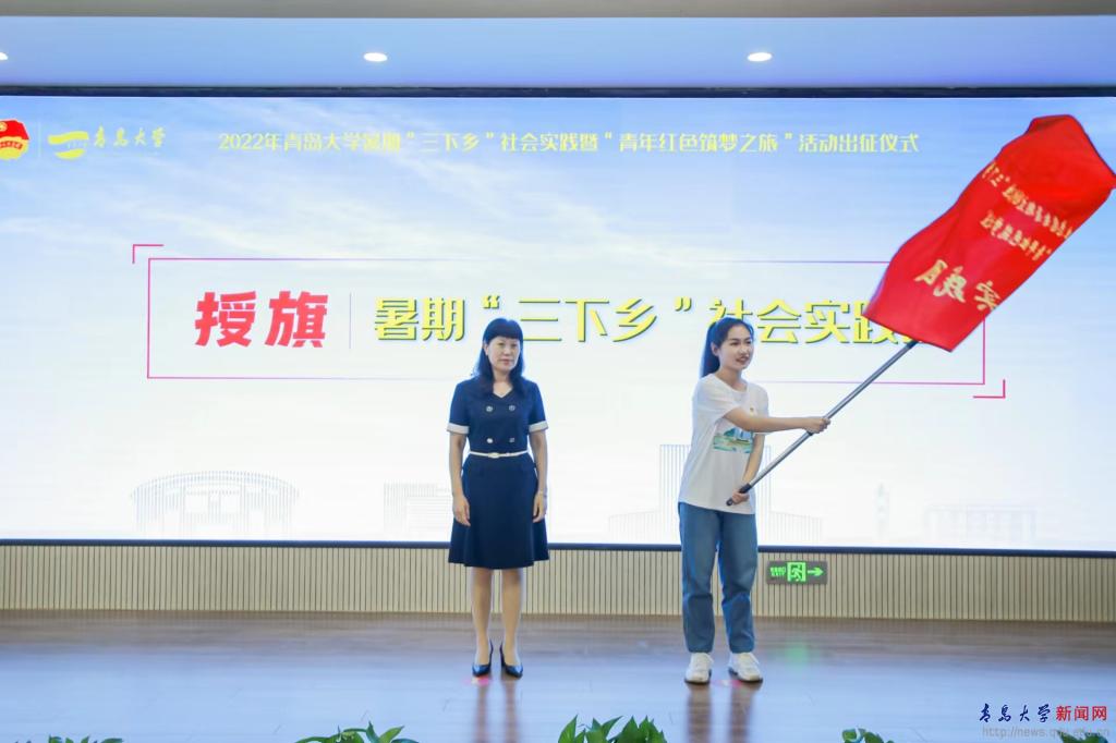劉彩云為我校2022年暑期“三下鄉(xiāng)”社會實(shí)踐暨“青年紅色筑夢之旅”授總旗。與會領(lǐng)導(dǎo)分別為2022年青島大學(xué)社會實(shí)踐團(tuán)隊(duì)代表授旗。