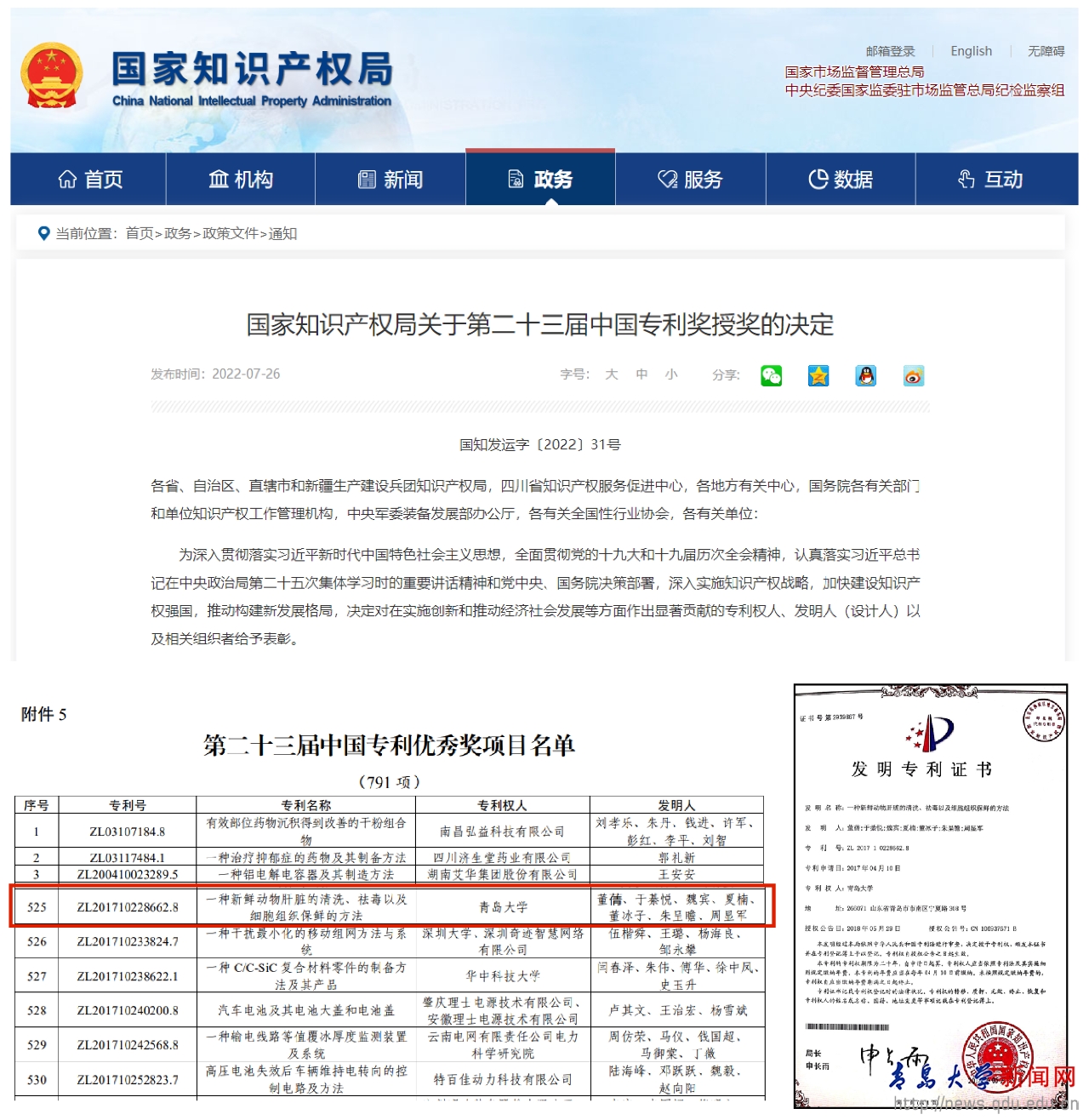 新聞網(wǎng)訊 7月26日,國(guó)家知識(shí)產(chǎn)權(quán)局公布了關(guān)于第二十三屆中國(guó)專利獎(jiǎng)授獎(jiǎng)的規(guī)定,根據(jù)《中國(guó)專利獎(jiǎng)評(píng)獎(jiǎng)辦法》規(guī)定,經(jīng)國(guó)務(wù)院有關(guān)部門知識(shí)產(chǎn)權(quán)工作管理機(jī)構(gòu)、地方知識(shí)產(chǎn)權(quán)局、有關(guān)全國(guó)性行業(yè)協(xié)會(huì),以及中國(guó)科學(xué)院院士和中國(guó)工程院院士等推薦,中國(guó)專利獎(jiǎng)評(píng)審委員會(huì)評(píng)審,社會(huì)公示,青島大學(xué)數(shù)字醫(yī)學(xué)與計(jì)算機(jī)輔助手術(shù)研究院研發(fā)的青英董氏祛毒豬肝技術(shù):“一種新鮮動(dòng)物肝臟的清洗、祛毒以及細(xì)胞組織保鮮的方法”(專利號(hào):ZL201710228662.8)榮獲第二十三屆中國(guó)專利獎(jiǎng)優(yōu)秀獎(jiǎng)!