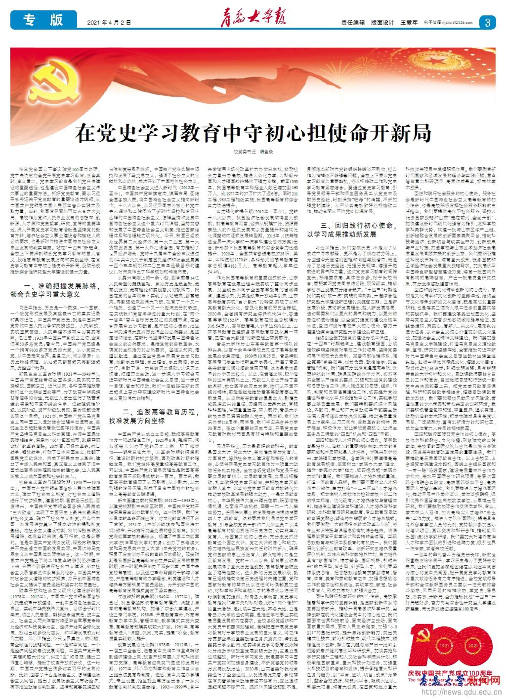 在全黨全國上下喜迎建黨100周年之際,黨中央決定在全黨開展黨史學習教育,正當其時、意義重大。黨史學習教育是我們黨自身建設的重要途徑,也是建設中國特色社會主義偉大事業的重要方法。抓好黨史教育,要以習近平總書記關于黨史教育的重要論述為統領,從中國共產黨領導中國人民百年奮斗實踐中汲取力量。當前,我國發展面臨百年未有之大變局,高校作為黨和人民事業發展的思想庫、創新源、人才泵和黨史教學、研究、宣傳的重要陣地,深入開展黨史學習教育是堅持黨的教育方針,培養社會主義事業建設者和接班人的必然要求,也是新時代推進中國特色社會主義事業發展的現實需要。站在“十四五”新起點,全校上下要深刻領會黨史學習教育的重大意義,找準高等教育發展方向和實踐坐標,在黨史學習教育中守初心擔使命開新局,汲取形成推動綜合性研究型大學建設的強大力量。