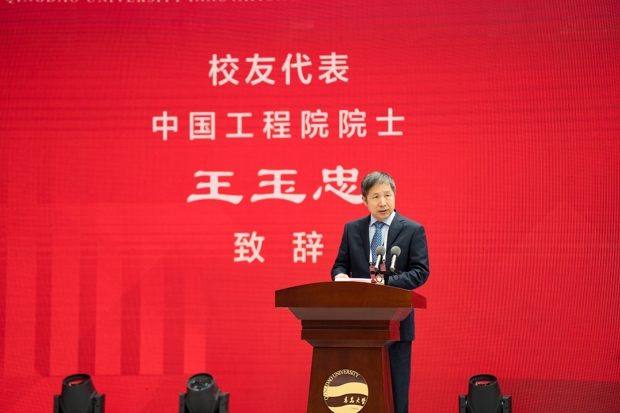 王玉忠代表青島大學校友致辭。他表示,愿與母校同仁一道,加快推動紡織科學與工程建成國家一流學科,為推動山東省紡織產業建成世界級產業集群貢獻青大力量。