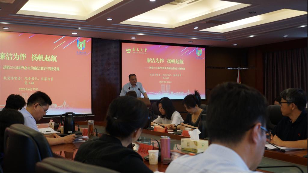 新聞網(wǎng)訊 6月13日,我校2023年大學(xué)生廉潔教育啟動儀式暨畢業(yè)生“青廉課堂”在辦公樓第一會議室舉行。校黨委常委、紀(jì)委書記、省監(jiān)委駐青島大學(xué)監(jiān)察專員范玉斌參加并為師生做廉潔教育專題黨課。活動由校紀(jì)委副書記張利主持。