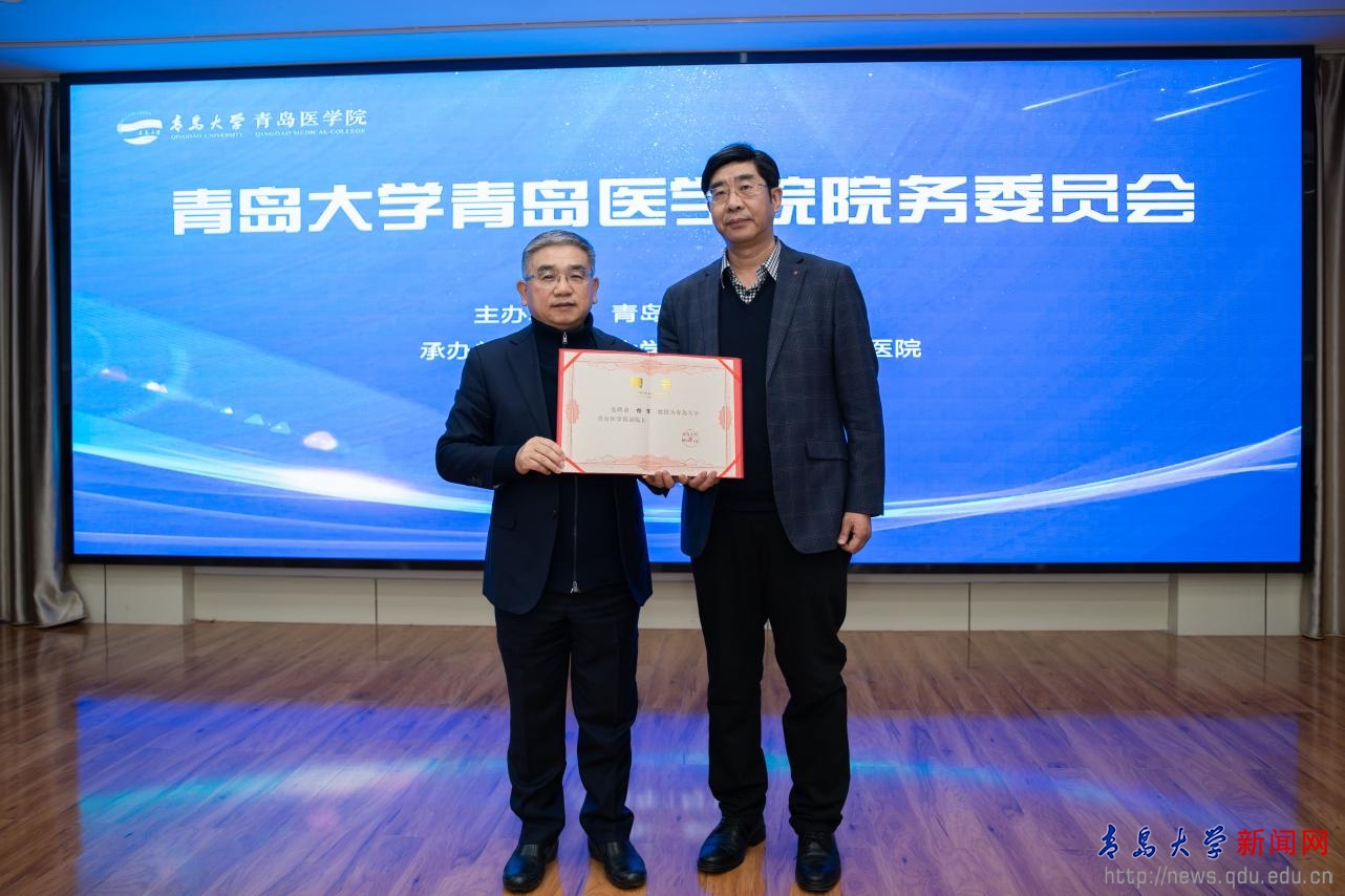 會前,李榮貴宣讀《關于調整青島大學青島醫學院院長、副院長聘任及院務委員會的通知》。胡金焱為新任院長、副院長頒發聘書。