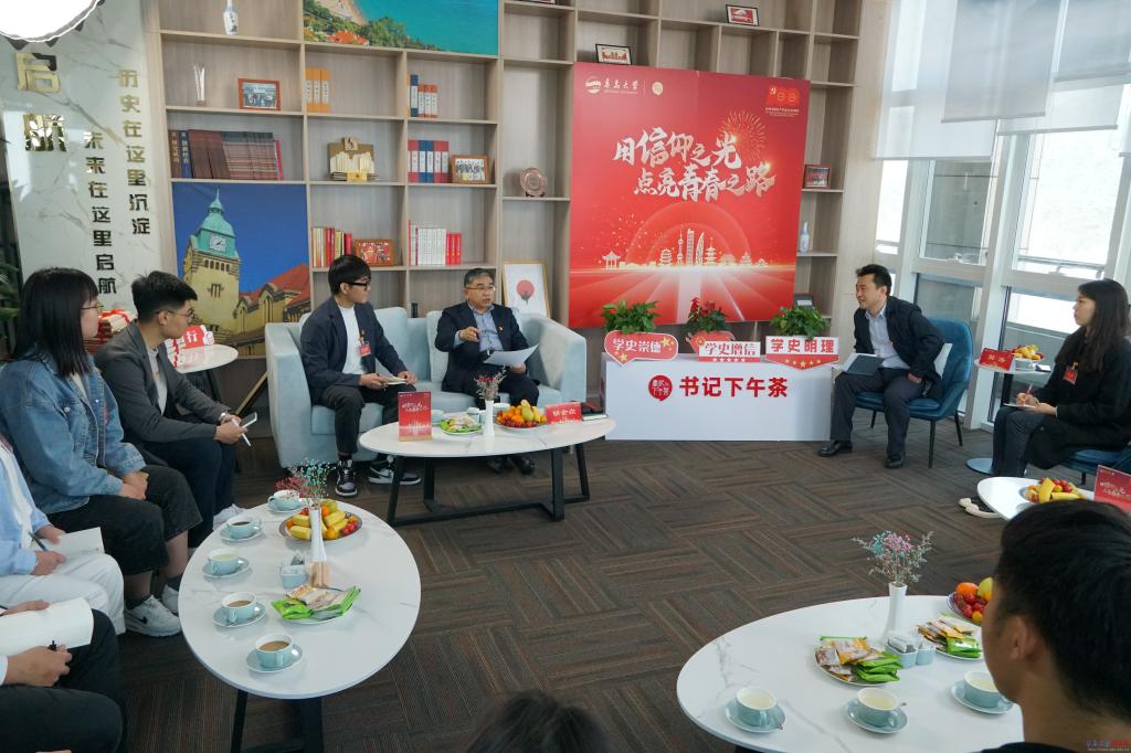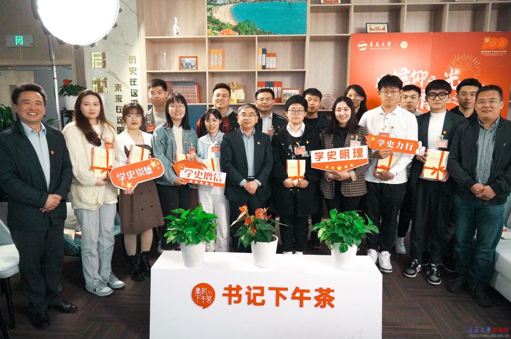 新聞網訊 4月9日,學校在浮山校區科技研發中心“印象青大”休閑茶吧舉辦第三期“書記下午茶”活動。本期活動,校黨委書記胡金焱與15名來自不同院系專業的學生代表,“用信仰之光點亮青春之路”為主題,圍繞黨史學習教育的意義、大學生如何學黨史和大學生入黨動機三個話題,聚焦學生成長發展,進行了面對面交流、零距離溝通。大家圍坐一堂,同飲下午茶,暢聊成長成才,暢談未來規劃。活動由黨委學生工作部部長解濤主持。