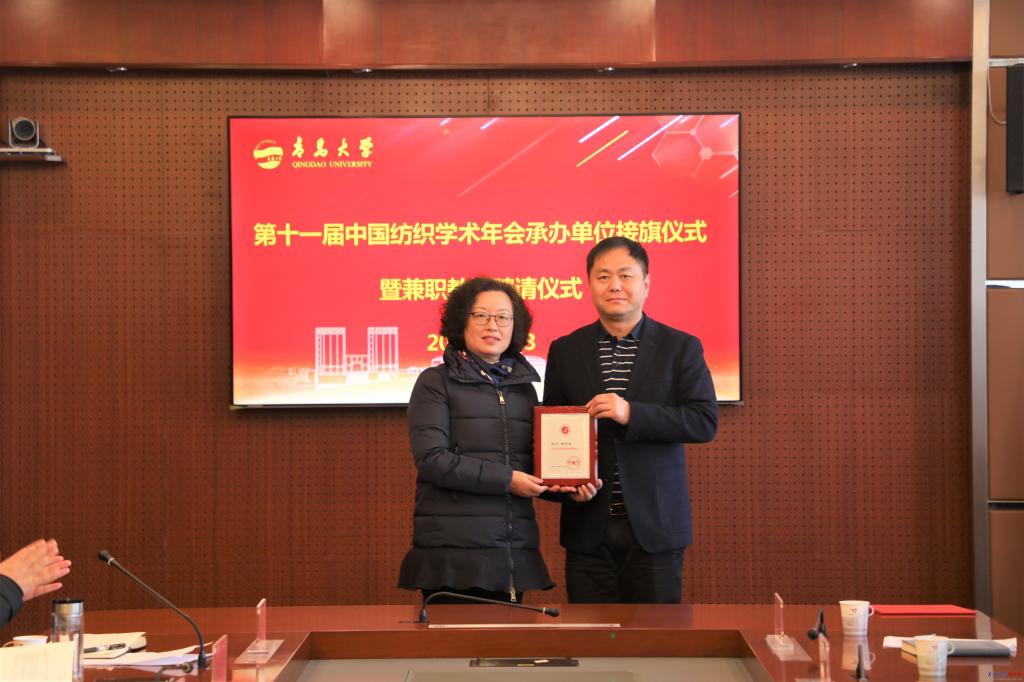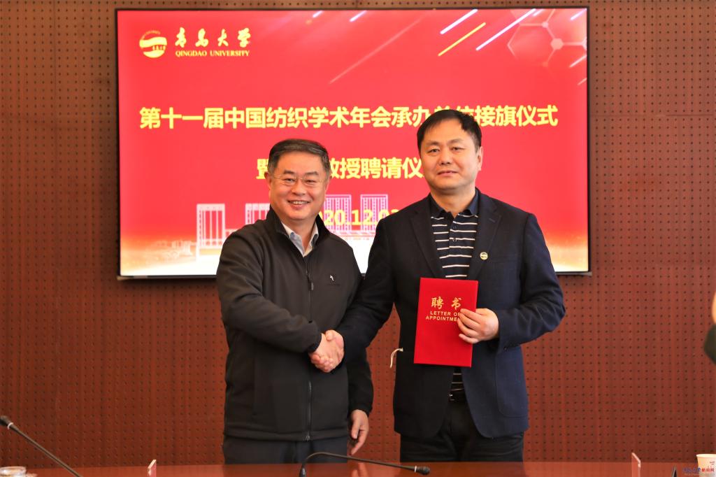 新聞網訊 12月3日,第十一屆中國紡織學術年會承辦單位接旗儀式在我校辦公樓第五會議室舉行。中國紡織工程學會理事長伏廣偉、青島大學校長夏東偉出席接旗儀式。儀式由中國紡織工程學會副理事長尹耐冬主持。夏東偉代表學校從伏廣偉手中接過中國紡織學術年會旗幟,紡織學術年會的“青大時間”正式開啟。