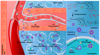 藥物在腫瘤組織中的低滲透嚴重影響其療效。本研究報道了一種雙響應(yīng)型藥物載體。當(dāng)納米載體暴露于腫瘤細胞,GGT觸發(fā)發(fā)生電荷反轉(zhuǎn),提高主動轉(zhuǎn)運能力。同時TAT可將藥物轉(zhuǎn)運至核仁,釋放DOX產(chǎn)生抗腫瘤活性。相關(guān)研究發(fā)表在Biomaterials上。我校材料科學(xué)與工程學(xué)院碩士研究生閆涵為第一作者,生物醫(yī)用材料與工程研究院為第一通訊單位。(全文鏈接:https://doi.org/10.1016/j.biomaterials.2023.122213)