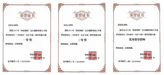 新聞網(wǎng)訊 9月22日至24日,2023年全國“田家炳杯”全日制教育碩士專業(yè)學(xué)位研究生學(xué)科教學(xué)(化學(xué))專業(yè)教學(xué)技能大賽決賽在云南師范大學(xué)舉行。我校化學(xué)化工學(xué)院教師萬延嵐、薛鎮(zhèn)鎮(zhèn)指導(dǎo)的2022級學(xué)科教學(xué)(化學(xué))專業(yè)研究生孫粒芯獲一等獎,劉圣元獲三等獎,薛鎮(zhèn)鎮(zhèn)榮獲優(yōu)秀指導(dǎo)教師稱號。
