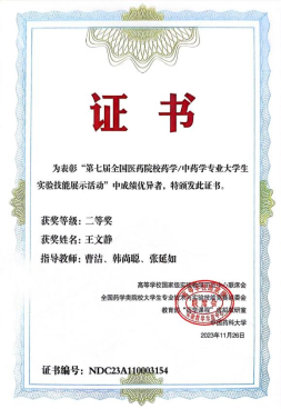 新聞網訊 11月24日-26日,由教育部高等學校國家級實驗教學示范中心聯席會、全國藥學類院校大學生專業技術與實驗技能競賽組委會、教育部“藥學課程”虛擬教研室和中國藥科大學共同舉辦的 “第七屆全國醫藥院校藥學/中藥學專業大學生實驗技能展示活動”在貴州遵義召開。我校藥學院2020級本科生王文靜、邢春曉分別斬獲競賽二等獎和三等獎。
