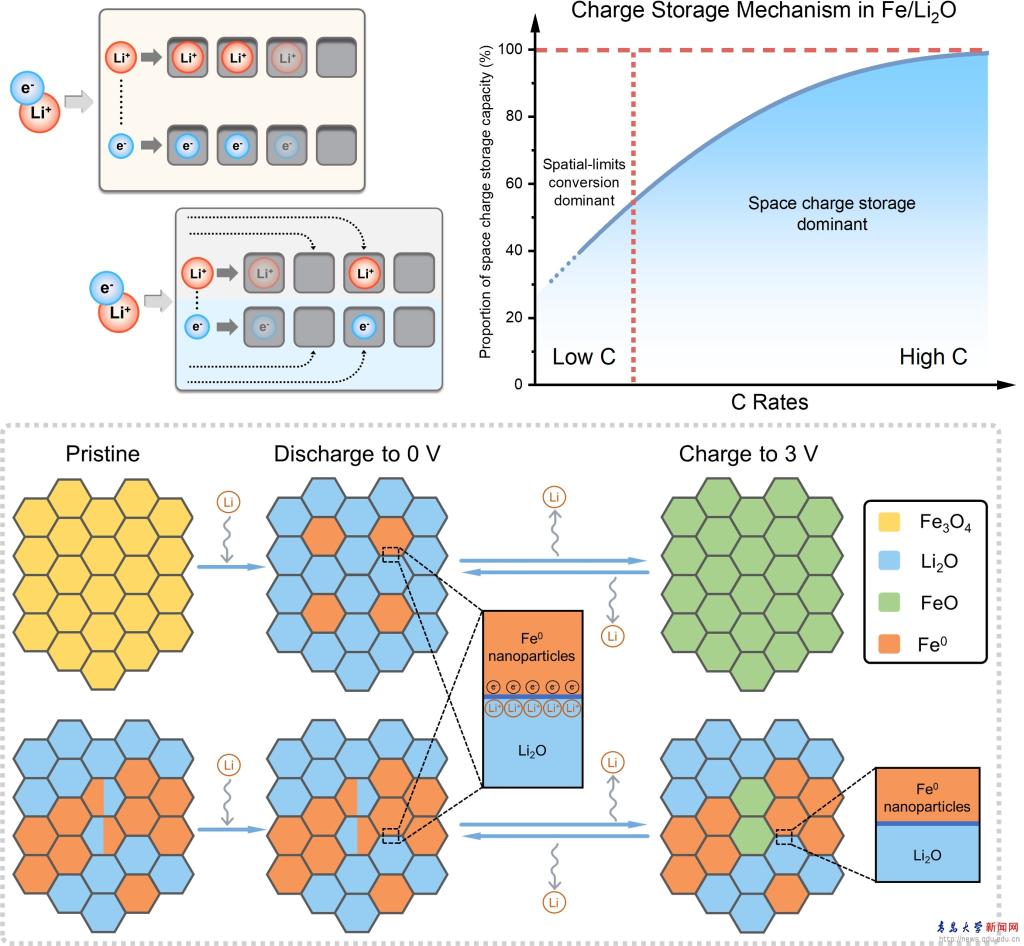 隨著電動汽車和便攜式電子設(shè)備的快速發(fā)展和大規(guī)模生產(chǎn)使用,開發(fā)具有快速充電能力和超長穩(wěn)定循環(huán)能力的鋰離子電池是目前科學(xué)研究的重點。但通常為了實現(xiàn)高倍率的充放電性能往往伴隨著電池能量密度的犧牲。在這項工作中,研究人員基于空間電荷存儲機制,成功構(gòu)建系列電子導(dǎo)體/離子導(dǎo)體電極材料(Fe/LixM (M=O, F, S, N)),同時兼具高能量密度、高倍率性能和高循環(huán)穩(wěn)定性。通過熱力學(xué)擬合結(jié)合磁學(xué)測試,提出了人工電子/離子導(dǎo)體電極材料的Li插入優(yōu)勢機制調(diào)控原則,并建立了相應(yīng)機制模型。這項研究創(chuàng)造了一種可行的方法,將卓越的空間電荷存儲機制引入到了快充電極材料的設(shè)計中,可以彌合當(dāng)前電極材料與未來電池應(yīng)用日益增長的要求之間的性能差距矛盾,同時證明了空間電荷存儲在下一代超快充電儲能系統(tǒng)中的潛在可行性。