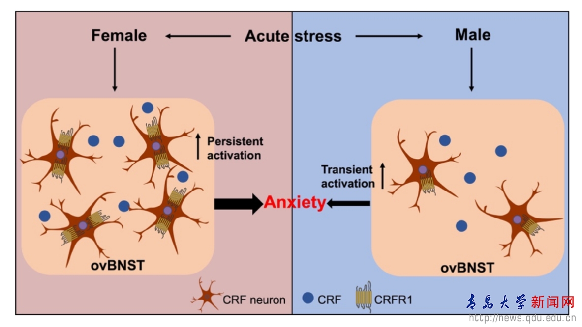 新聞網(wǎng)訊 隨著現(xiàn)代社會(huì)生活和工作壓力的增加,焦慮等情感障礙類(lèi)疾病的發(fā)生越來(lái)越普遍。流行病學(xué)調(diào)查顯示女性焦慮障礙的發(fā)病率是男性的兩倍,但造成焦慮性別差異的神經(jīng)機(jī)制并不清楚。近日,青島大學(xué)醫(yī)學(xué)部神經(jīng)精神疾病研究院張遐/王穎團(tuán)隊(duì)在Science Advances雜志(Science子刊)上發(fā)表文章Hyperexcitation of ovBNST CRF neurons during stress contributes to female-biased expression of anxiety-like avoidance behaviors。該研究發(fā)現(xiàn)雌性和雄性小鼠ovBNST中CRF受體(CRFR1)的表達(dá)和功能差異可介導(dǎo)急性應(yīng)激狀態(tài)下ovBNST CRF神經(jīng)元興奮模式產(chǎn)生雌雄差異,并進(jìn)一步導(dǎo)致焦慮易感性性別差異。該研究得到了科技部2030重大項(xiàng)目和國(guó)家自然科學(xué)基金委重大項(xiàng)目的支持。基礎(chǔ)醫(yī)學(xué)院神經(jīng)生物學(xué)研究生張娜、趙莎和科研助理馬彥巧為第一作者;醫(yī)學(xué)部神經(jīng)精神疾病研究院張遐教授和王穎助理教授為該論文的共同通訊作者。