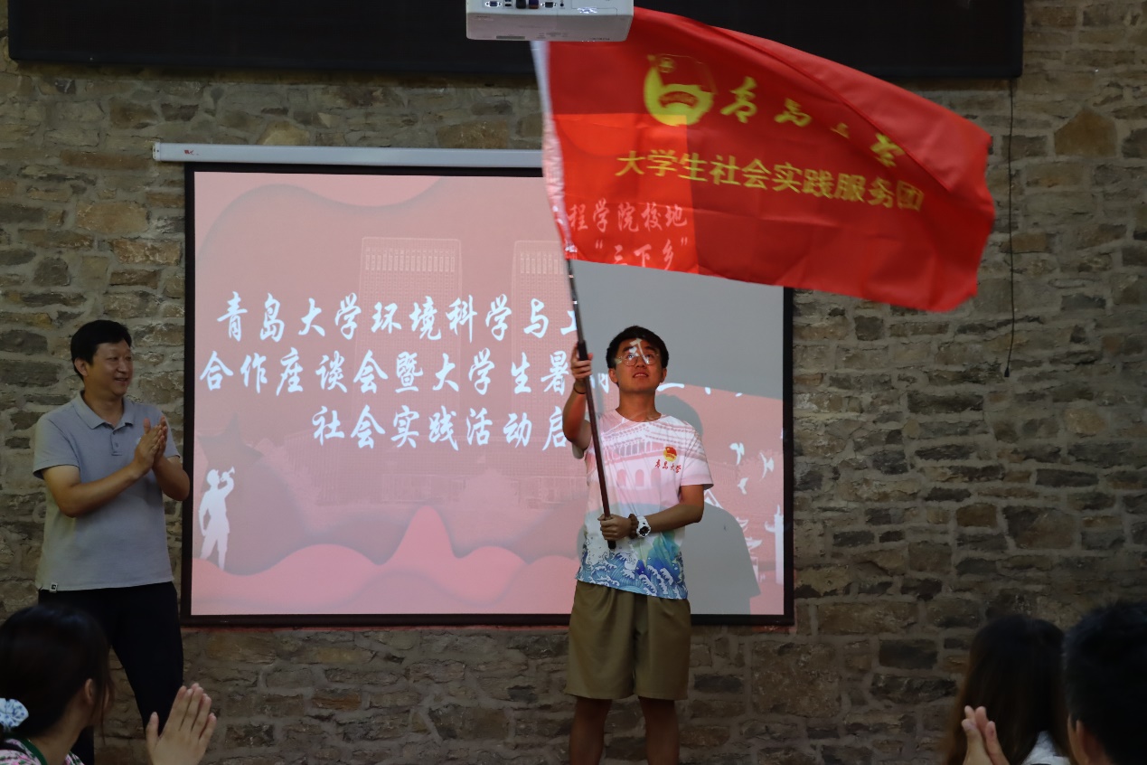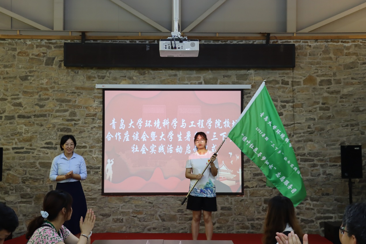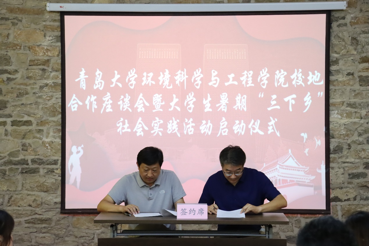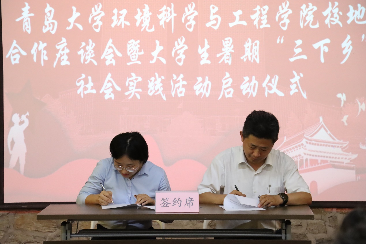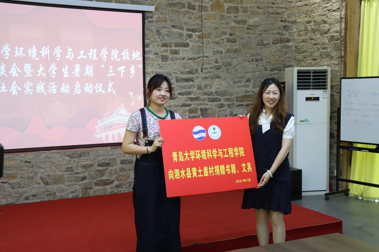 隨后,環境科學與工程學院分別與濟寧市生態環境局泗水分局、共青團泗水縣委分別簽訂了《大學生實踐育人聯合培養協議》,雙方商定在社會實踐、專業實習等方面密切合作,進一步增強實踐育人功能,聯合培養既有豐厚的理論知識、又有充足的社會實踐經驗的綜合性高素質人才。濟寧市生態環境局泗水縣分局、泗水縣團委還為學院兩支暑期“三下鄉”社會實踐活動團隊——“美麗泗水”鄉村生態振興實踐團和“綠葉紅花,尋夢泗水”志愿服務團授旗。最后,此次泗水社會實踐活動團隊負責人顏實同學發言,表達了同學們利用這次暑假做好泗水鄉村生態振興與環境保護的決心和信心。劉妍妍代表學院還為泗水縣柘溝鎮黃土崖村捐贈了書籍、文具等學習物資。