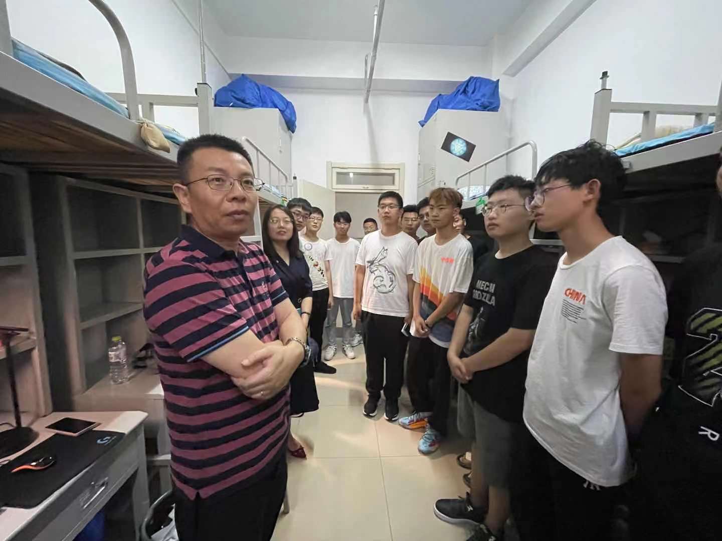 在新生宿舍,領導老師與新生們親切交談,仔細詢問新生在學校衣、食、住、行各方面的問題,認真聆聽學生對學校環境、學院迎新工作的感受,詳細了解每位學生的基本情況和入學心情,向同學們傳達學院的熱情問候與殷切期望。姜宏副校長叮囑新生,要充分利用好學院搭建的教育教學、科研學術、創新創業等平臺,高標準嚴要求,以飽滿的熱情投入到新階段的學習生活中去。學工人員就宿舍用電安全、人身安全、財產安全、宿舍衛生等一一作了安排,