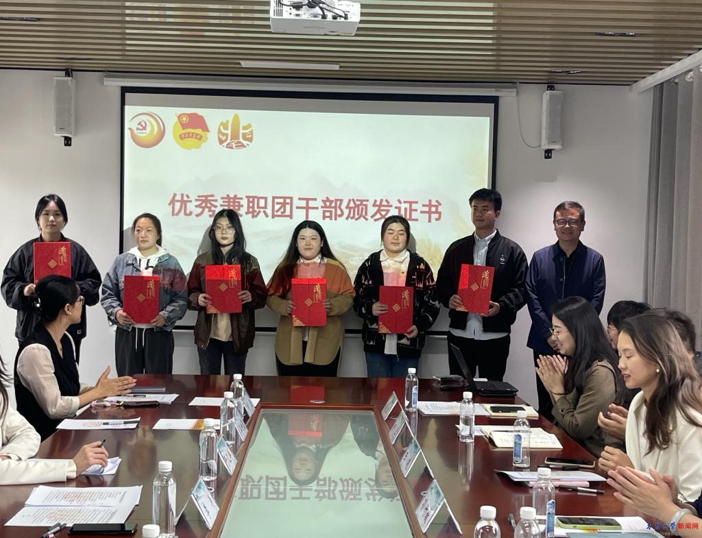 李濤、孫竹媛、青島世家百草生物科技有限公司負責人辛學詩共同為大學生實踐育人基地揭牌,并為優秀兼職團干部頒發了證書。