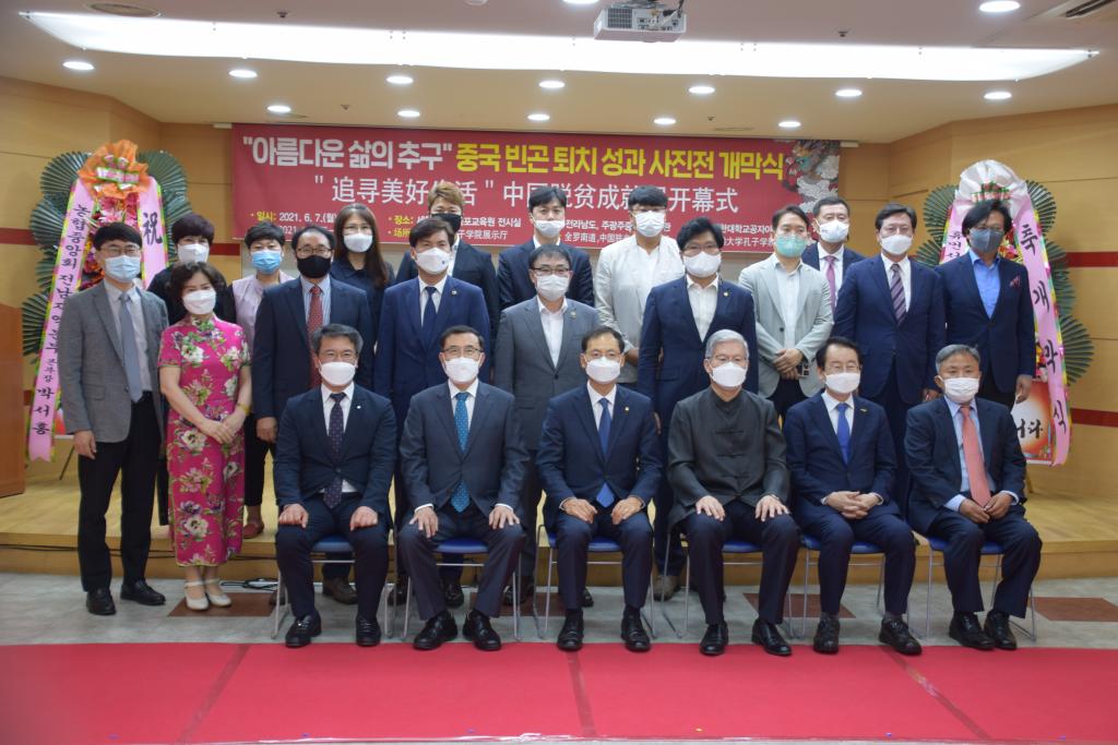 新聞網訊 6月7日,在韓國世翰大學孔子學院舉行“追尋美好生活”中國脫貧成就展開幕式。本次脫貧成就照片展由中國駐光州總領事館、全羅南道道廳共同主辦,由世翰大學孔子學院承辦。張承剛總領事、全羅南道政務副知事宋庠烙、木浦市長金鐘植、世翰大學總長李昇勛等全南地區政府機關和文化界、教育界、新聞媒體、華僑代表,留學生代表以及友好團體代表等50多位人士出席。